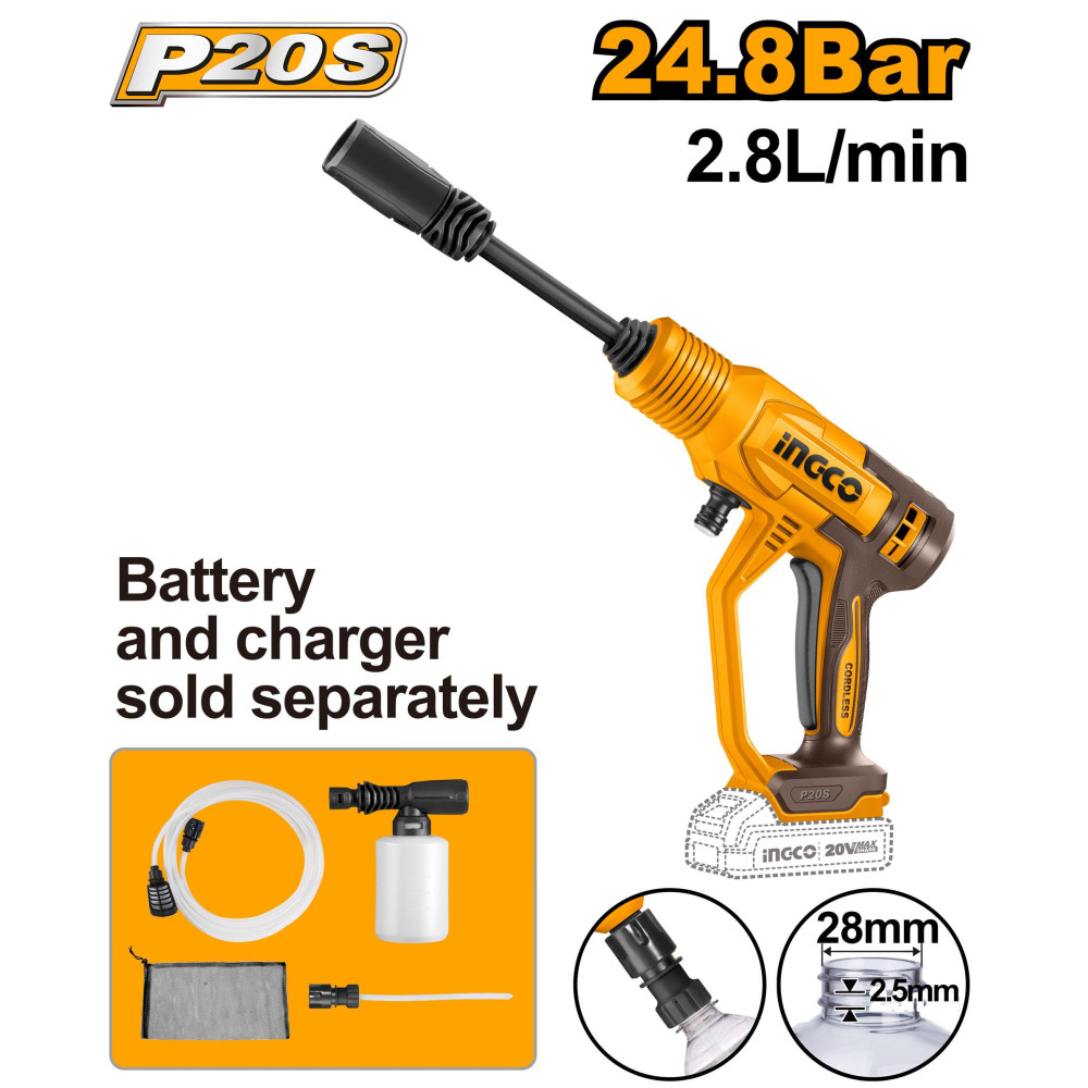 Аккумуляторная мойка 20В без АКБ и ЗУ SUPER INGCO CPWLI2036 идеальный помощник для деликатной очистки садового инвентаря, мебели, велосипедов и других поверхностей. Аппарат пригоден для ухода за садовыми растениями.