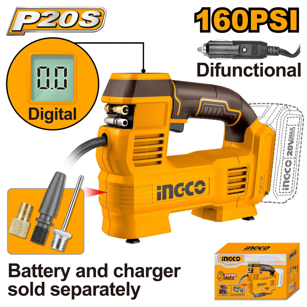 Автомобильный аккумуляторный компрессор 20В без АКБ и ЗУ SUPER INGCO CACLI2012 серии P20S может работать от прикуривателя автомобиля 12В, это компактное приспособление, которое с легкостью поместится в багажник любого транспорта.