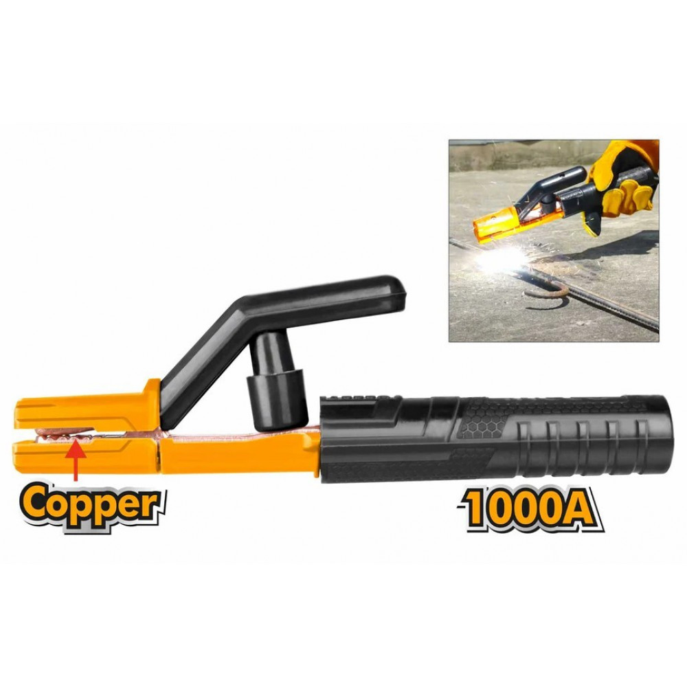 Держатель электродов 1000А INGCO WAH10008 INDUSTRIAL предназначен для надежной фиксации и удержания электрода и подвода к нему тока во время сварочных работ методом MMA.