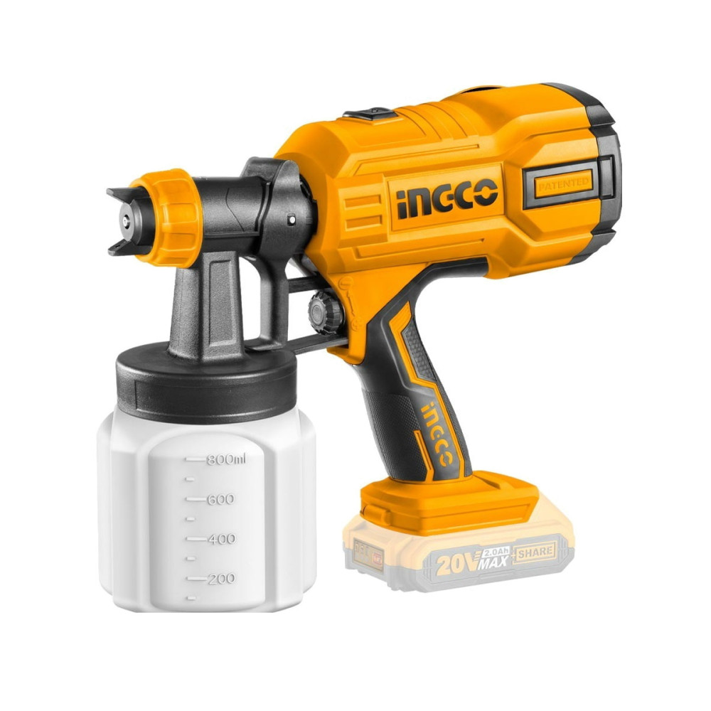 Аккумуляторный краскопульт 20В без АКБ и ЗУ INGCO CSGLI2003 используется для обработки поверхности водно-меловыми и водно-известковыми составами при строительно-отделочных работах, при опрыскивании и побелке садов, дезинфекции помещений.