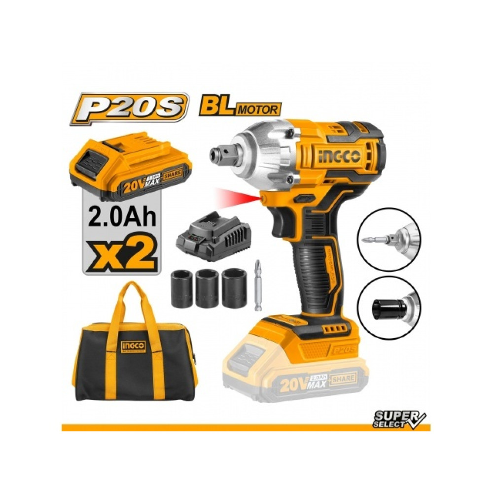 В комплекте: Гайковерт-импакт -1шт. аккумуляторные батареи 20В 2Ач - 2шт., зарядное устройство - 1шт., 3 торцевых головки ударные (17,19,21 мм), инструкция.