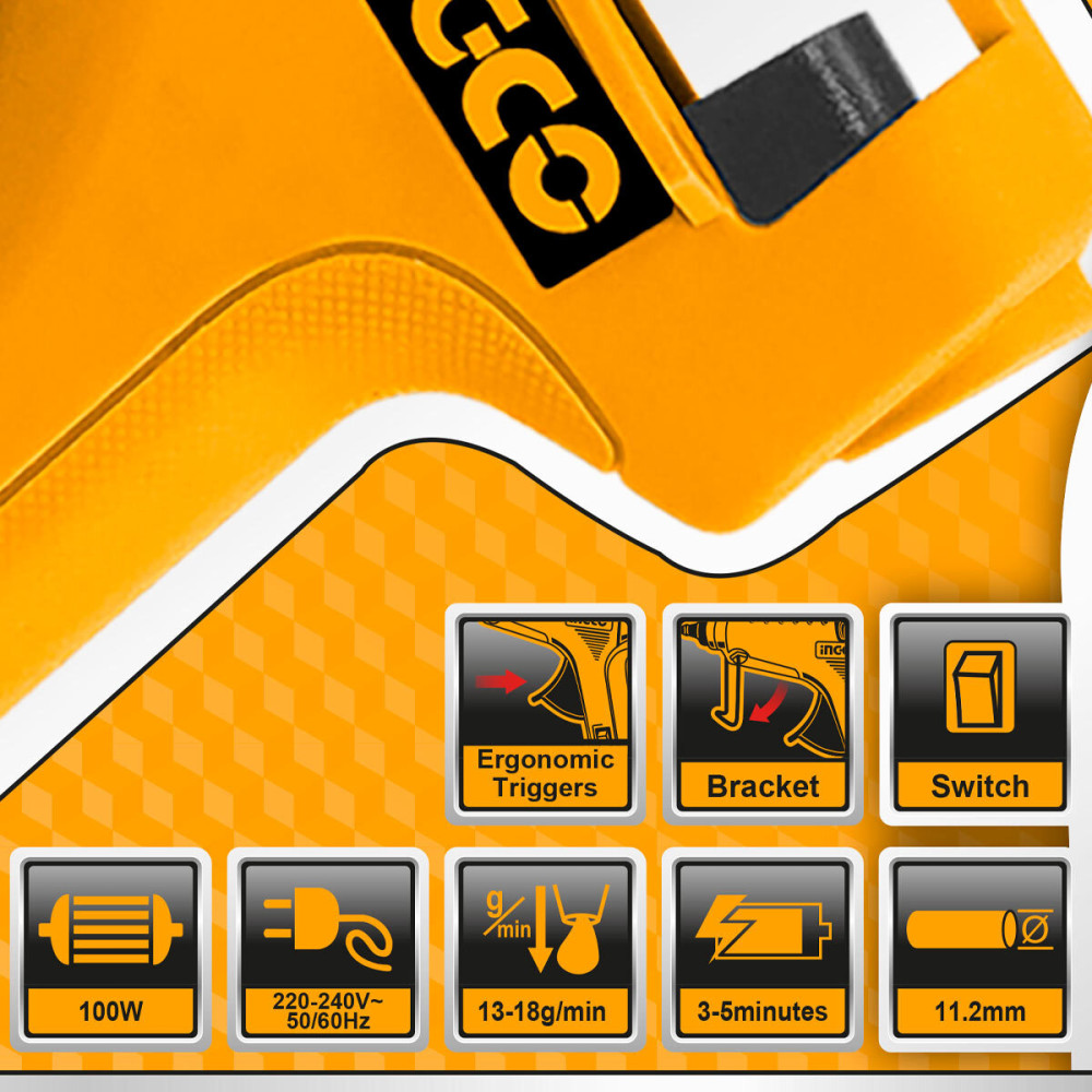 Клеевой пистолет 100 Вт INGCO GG6008 применяется на заводах,мебельных фабриках, при проведении отделочных и строительных работ.
