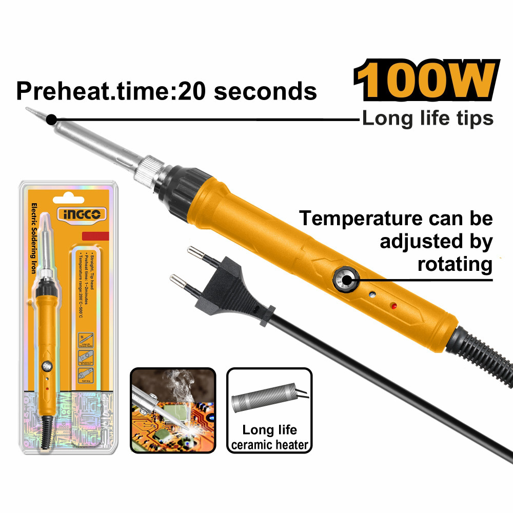Паяльник электрический прямое, конусное 100Вт SUPER INGCO SI0110831 может быть использован для решения широкого круга задач, например: ремонт проводов, пайка и замена радиодеталей, ремонт тонкостенных металлических трубных соединений, быстрый прожиг отверстий в пластике, отрезка лишних частей в пластиковых деталях и корпусах.
