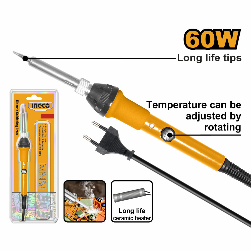 Паяльник электрический прямое, конусное 60Вт SUPER INGCO SI016831 может быть использован для решения широкого круга задач, например: ремонт проводов, пайка и замена радиодеталей, ремонт тонкостенных металлических трубных соединений, быстрый прожиг отверстий в пластике, отрезка лишних частей в пластиковых деталях и корпусах.