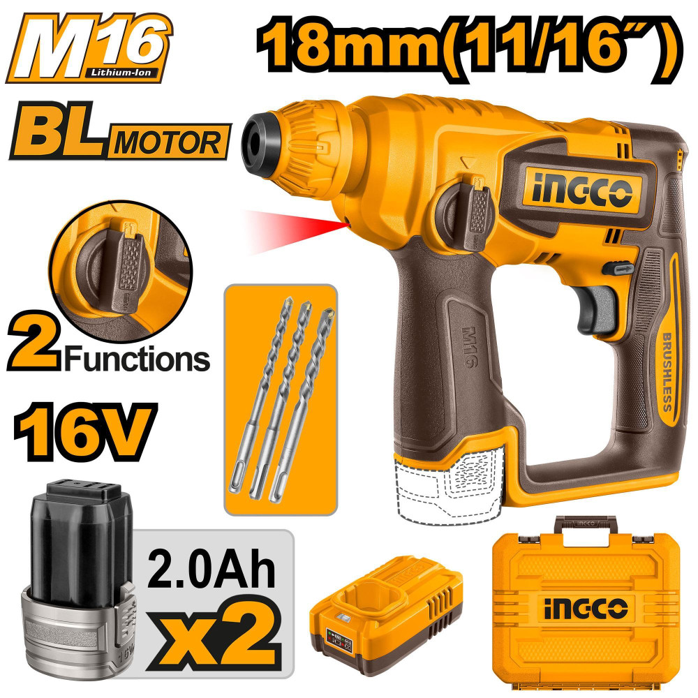 Аккумуляторный перфоратор 16В BL 1.8Дж 2хАКБ 2Ач и ЗУ INGCO CRHLI16168 INDUSTRIAL предназначен для сверления отверстий в бетоне, кирпиче и природном камне.