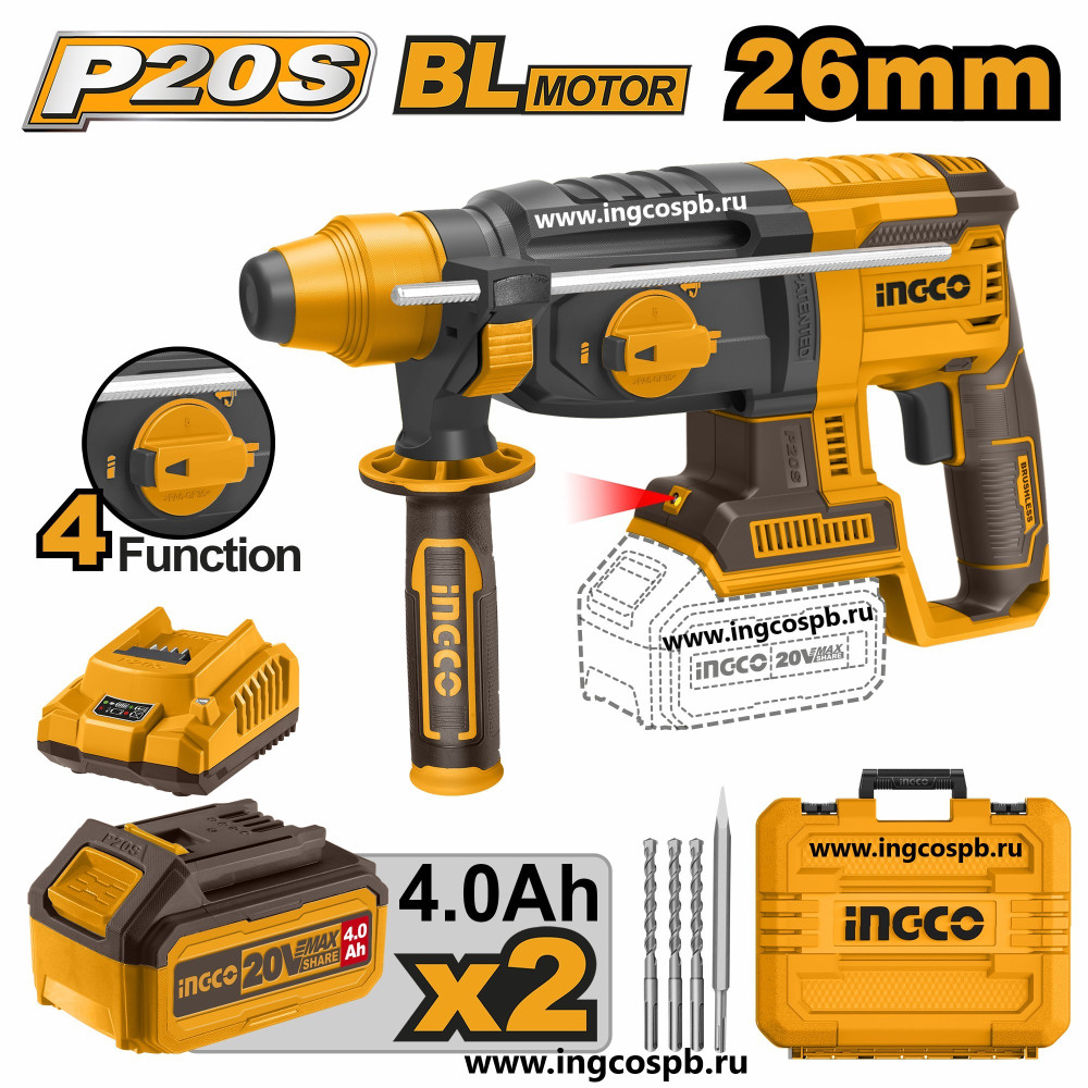Аккумуляторный перфоратор BL 20В, 2хАКБ 4Ач и ЗУ SUPER INGCO CRHLI202287 INDUSTRIAL предназначен для сверления отверстий в бетоне, кирпиче и природном камне, а также для легких долбежных работ. Он также пригоден для сверления отверстий в древесине, металле, керамике и синтетических материалах.