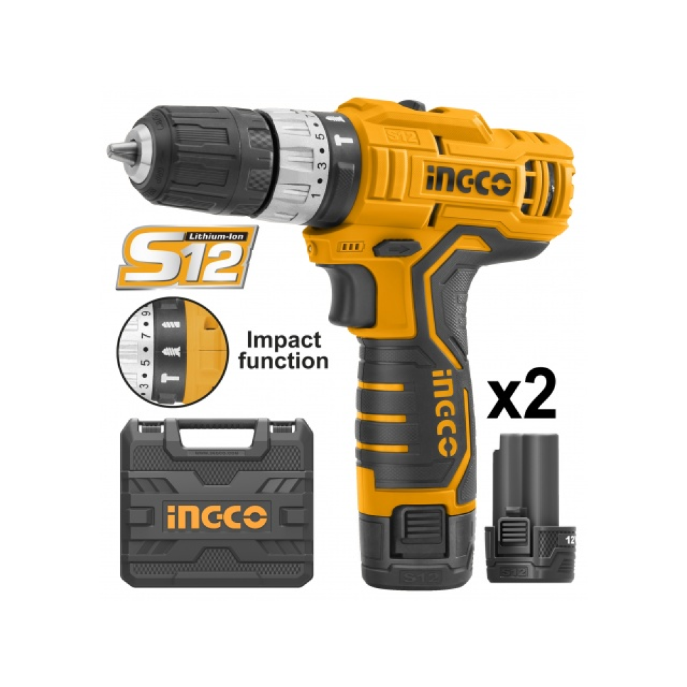 Аккумуляторный ударный шуруповертINGCOCIDLI1232 серии аккумуляторного инструмента S12 предназначендля сверления отверстий в пластике,древесине, металле, закручивания саморезов, винтов и прочих крепёжных элементовпри сборке мебели, монтаже различных конструкций, выполнении ремонтных, строительных и отделочных работ как внутри зданий, так и на улице.
