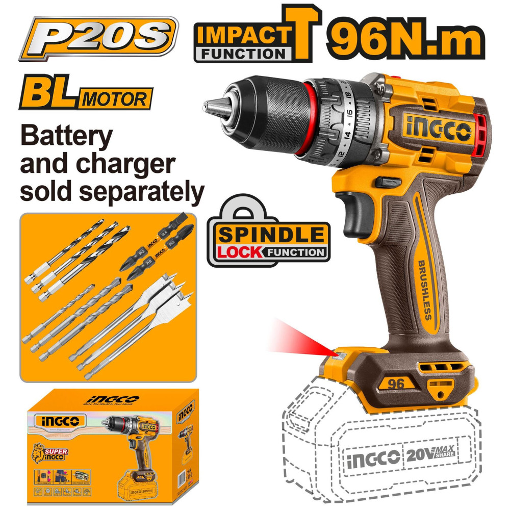 Аккумуляторный ударный шуруповерт 20B BL 66Hm 22+1+1 без АКБ и ЗУ SUPER INGCO CIDLI206681 INDUSTRIAL предназначен для сверления отверстий в пластике, древесине, металле, закручивания саморезов, винтов и прочих крепёжных элементов при сборке мебели, монтаже различных конструкций, выполнении ремонтных, строительных и отделочных работ как внутри зданий, так и на улице.