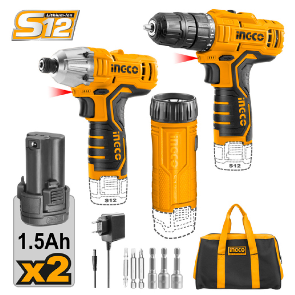 Набор аккумуляторного инструмента 12В 3 шт INGCO CKLI1203 включает в себя Шуруповерт 20Hm и Импульсныйвинтоверт 100 Нм линейки STANDART.