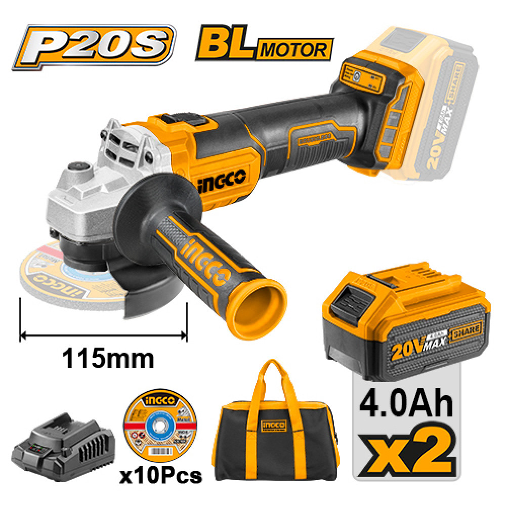 Комплект аккумуляторная угловая шлифмашина 115мм INGCO CAGLI2011582 SUPER SELECT INDUSTRIAL в качестве источника питания инструментов используется литий-ионный аккумулятор 20 В.