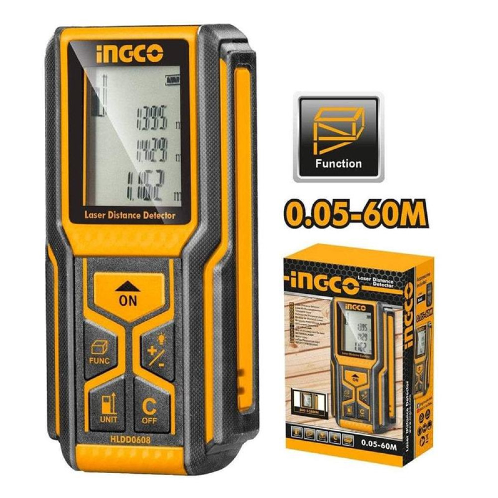 Лазерный дальномер 60 м INGCO HLDD0608 может быть использован измерения расстояния как в помещении, так и на улице в диапазоне от 0,05 м до 60 м с погрешностью 2 мм.
