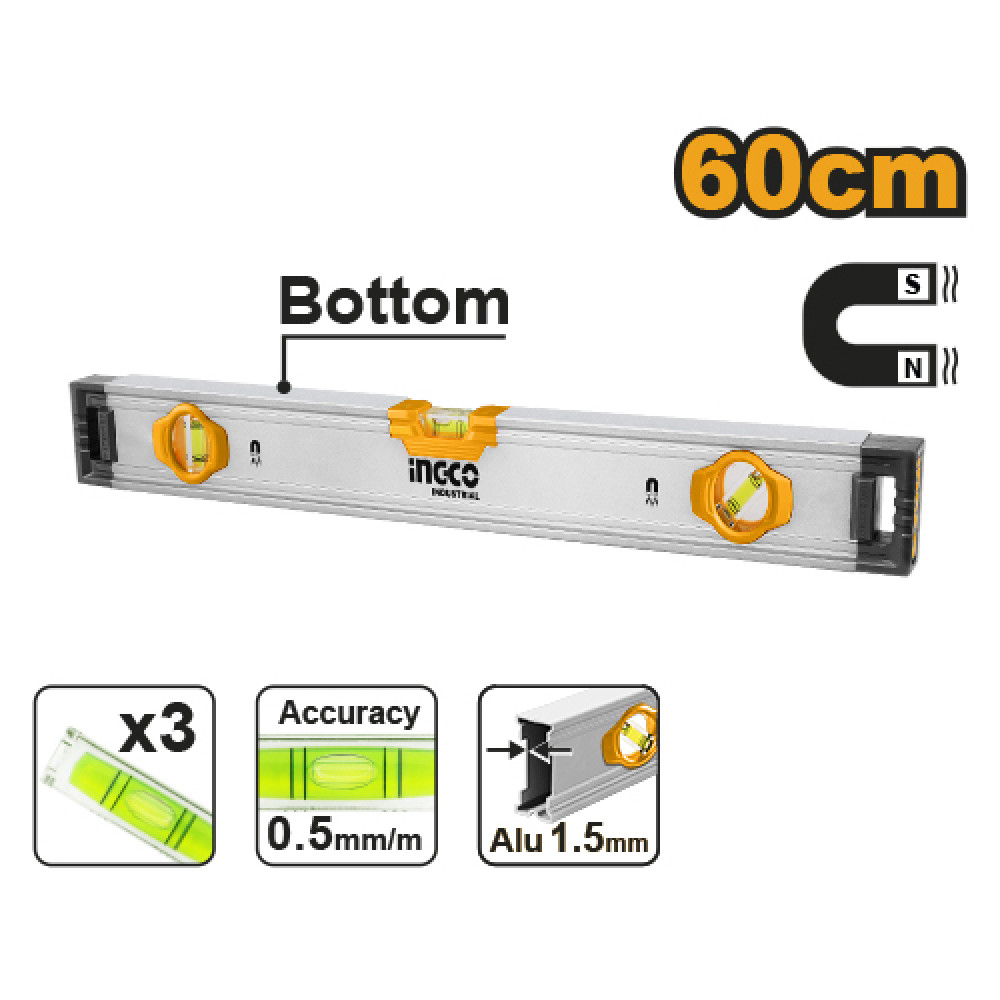 Алюминиевый магнитный строительный уровень 600 мм INGCO HSL38060M INDUSTRIAL оснащен 3 глазками, удобный в применении измерительный инструмент для проверки правильности вертикали или горизонтали.