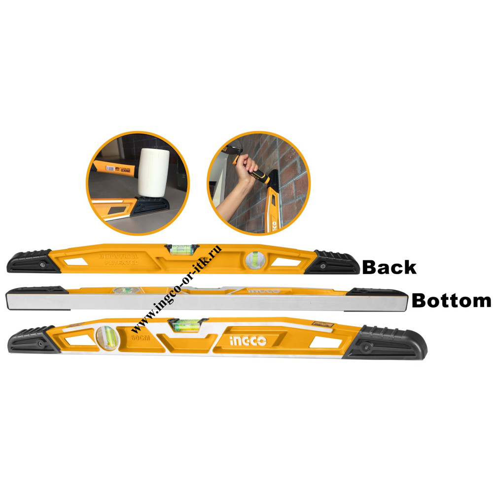 Уровень усиленный 60 см INGCO HBSL08060 INDUSTRIAL оснащен двумя глазками для выявления отклонения поверхности по горизонтали и вертикали.