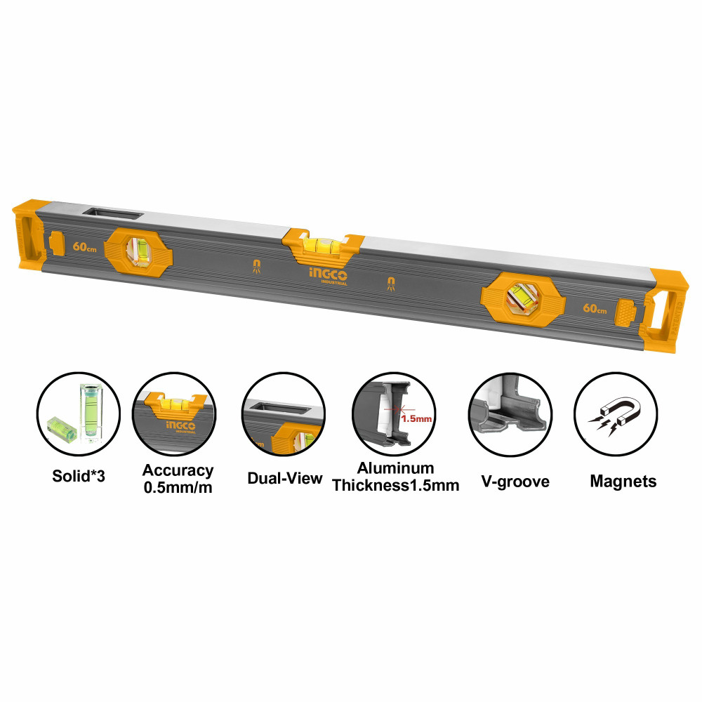 Уровень усиленный магнитный 600 мм INGCO HSL68060 INDUSTRIAL прочный и надежный инструмент для выявления отклонения поверхности. Уровень имеет встроенные 2 ударопрочных полиакриловых колбы. Одна из них с системой PLUMBSITE, что даёт возможность работать как с боковой стороны, так и с фронтальной.