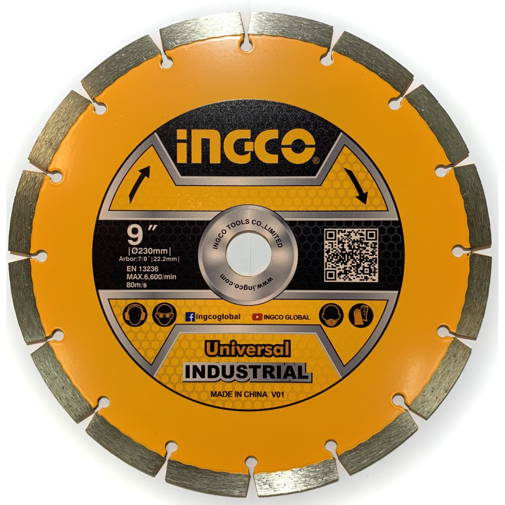 Диск алмазный сегментный 230х10х22мм INGCO DMD012301 INDUSTRIALпредназначен как для сухой , так и для мокрой резки кирпича, бетона, известняка, натурального и искусственного камня с помощью угловой шлифовальной машины.