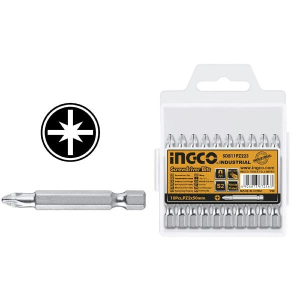 Набор бит PZ2х50 10 шт. INGCO SDB11PZ223 INDUSTRIAL с шестигранным хвостовиком поставляется в пластиковом футляре.