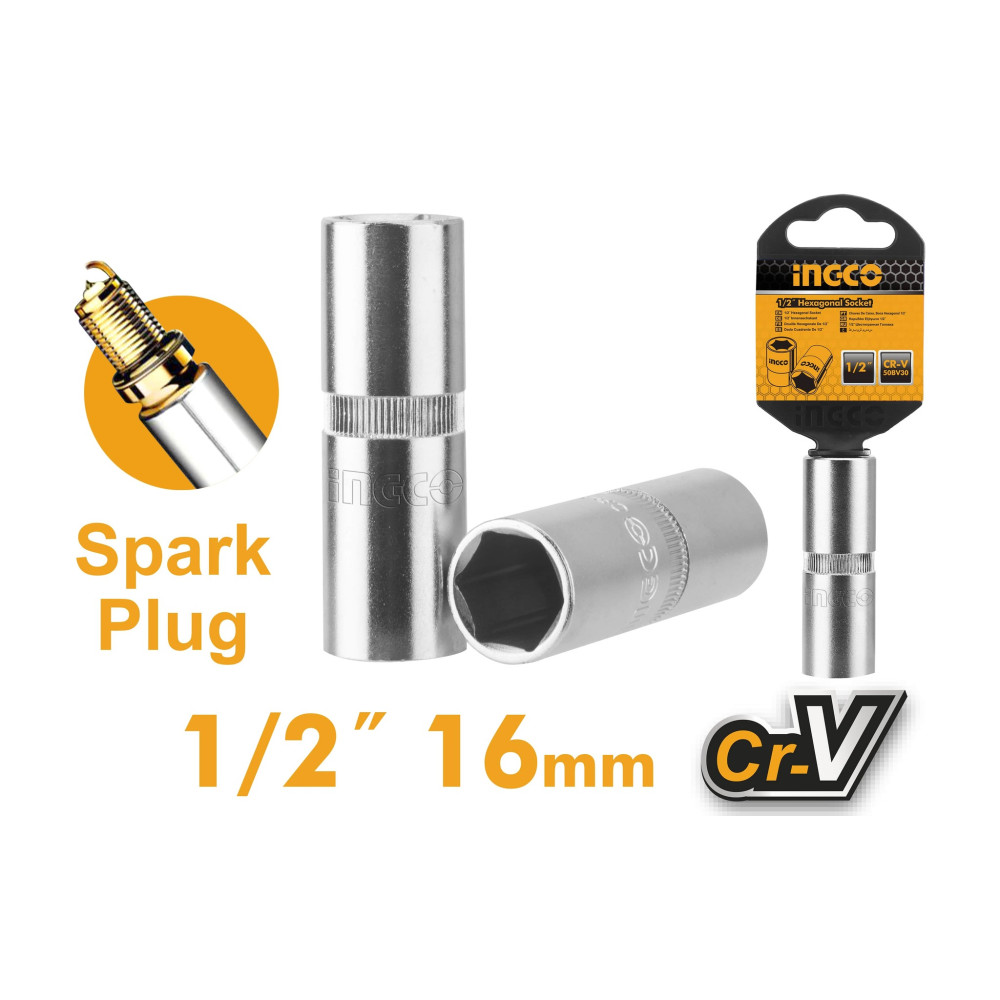 Головка для свечей зажигания 6 гр, 16 мм, 1/2", INGCO HSPS12161 INDUSTRIAL используется для снятия или установки свечей зажигания бензиновых двигателей внутрен него сгорания.