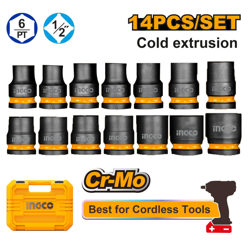 Набор головок ударных 1/2 10-27 14шт. SUPER INGCO HKISSD12141 INDUSTRIAL используется совместно с гайковертами для монтажа или демонтажа резьбовых соединений.
