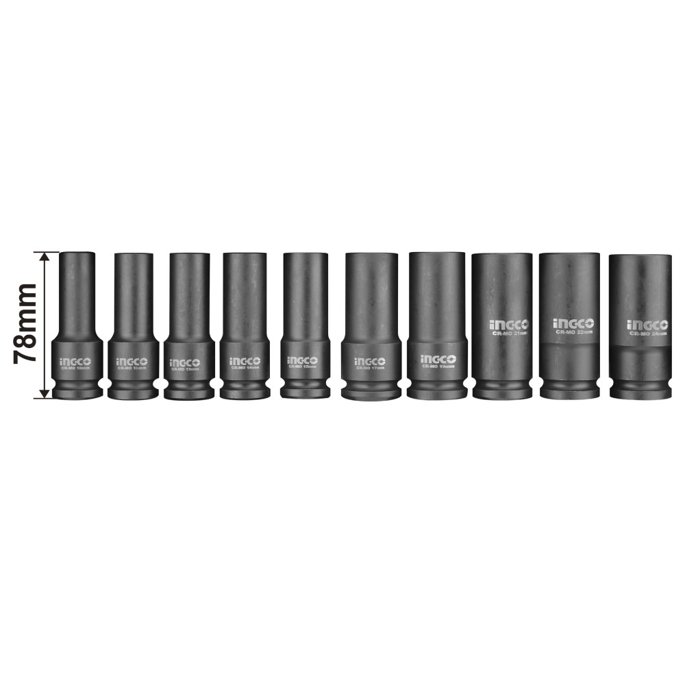 Набор ударных торцевых глубоких головок 1/2" INGCO HKISSD12102L INDUSTRIAL используется совместно с гайковертами для монтажа или демонтажа резьбовых соединений.