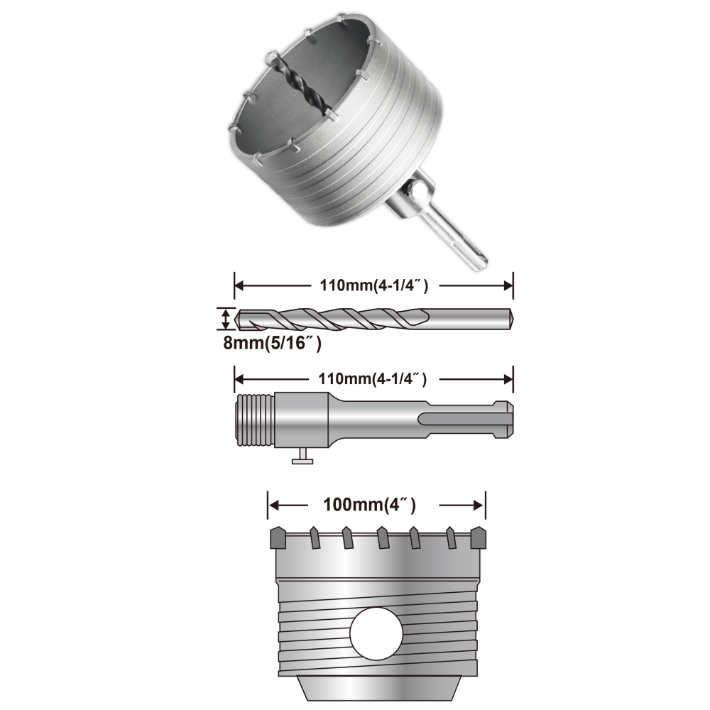 - В комплекте центрирующее сверло 8x120 мми адаптерSDS-Plus 110 мм.