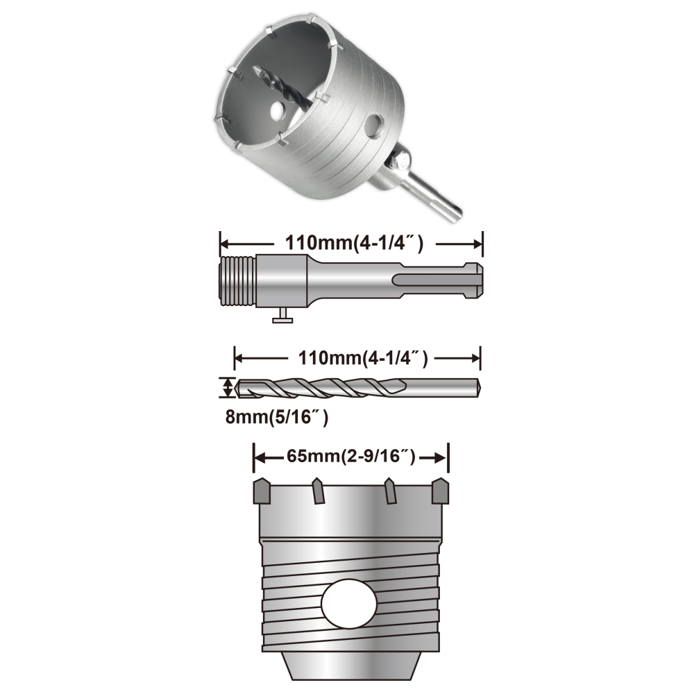 - В комплекте центрирующее сверло 8x120 мми адаптерSDS-Plus 110 мм.