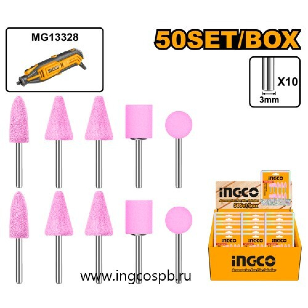 Набор шарошек абразивных для гравера 10шт. INGCO AKB1012 используется для шлифования изделий из стали и цветных металлов с помощью гравировальной машинки.