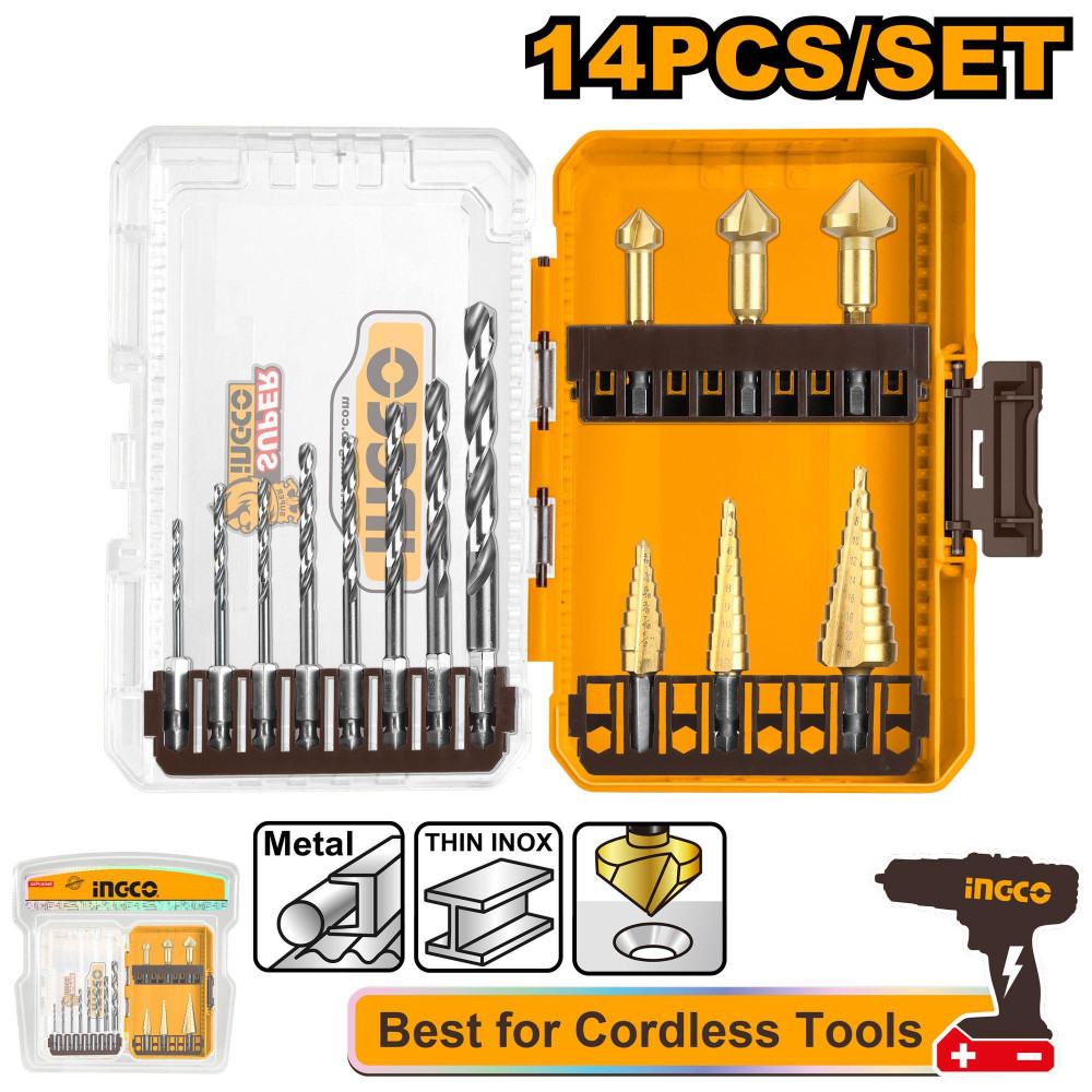 Набор сверл по металлу HEX 14 шт. HSS INGCO AKDL61401 INDUSTRIAL предназначены для использования в дрелях и шуруповертах, включает 8 сверл по металлу от 2-6мм, 3 ступенчатых сверла с шагом: 4-12 мм, 5 ступеней, 4-12 мм, 9 ступеней, 4-22 мм, 10 ступеней, зенковки 12.4/16.5/20.5 мм