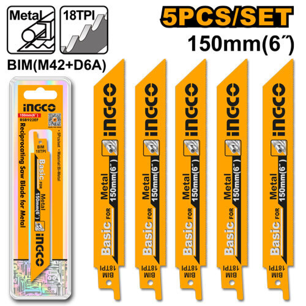 Набор пильных полотен 5шт. для сабельной пилы по металлу 18T-BIM 150х19х0.9мм INGCO RSB922EF