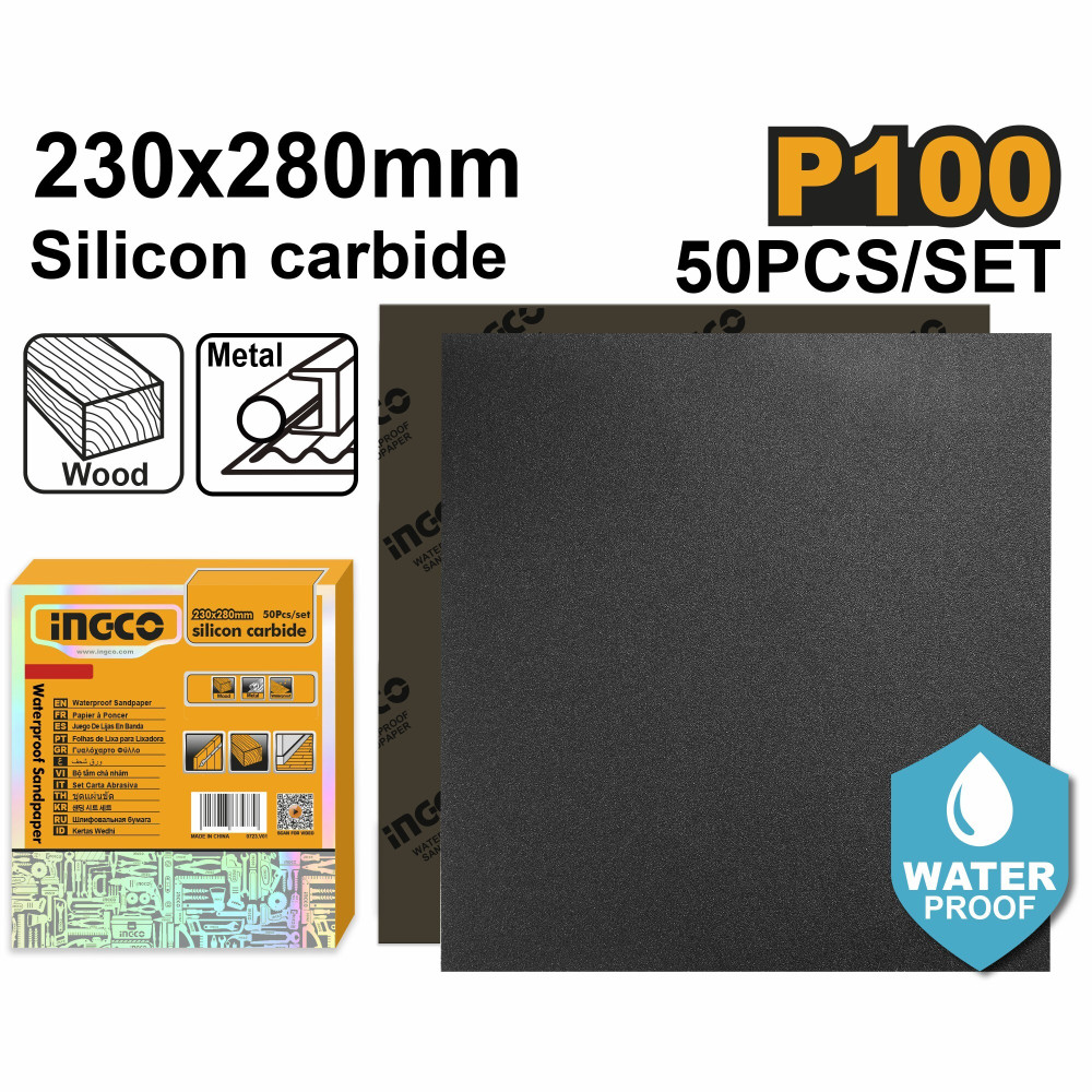 Бумага наждачная водостойкая P100 230x280мм, 50шт. INGCO AKHS010016 INDUSTRIAL применяется для обработки поверхностей вручную или машинным способом.
