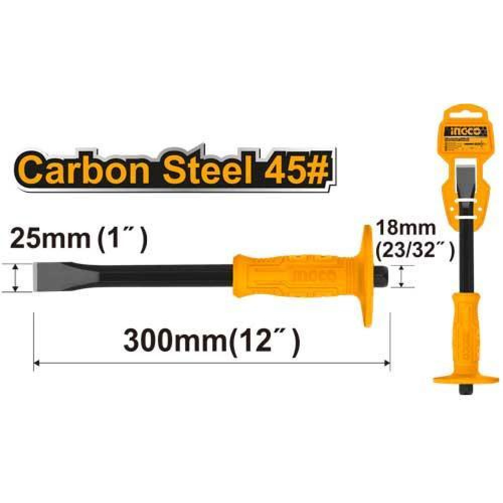 Зубило плоское с протектором 300х18х24 мм INGCO HCCL082412используется для раскалывания кирпича, блоков из газосиликата и пенобетона, а также иных строительных материалов.