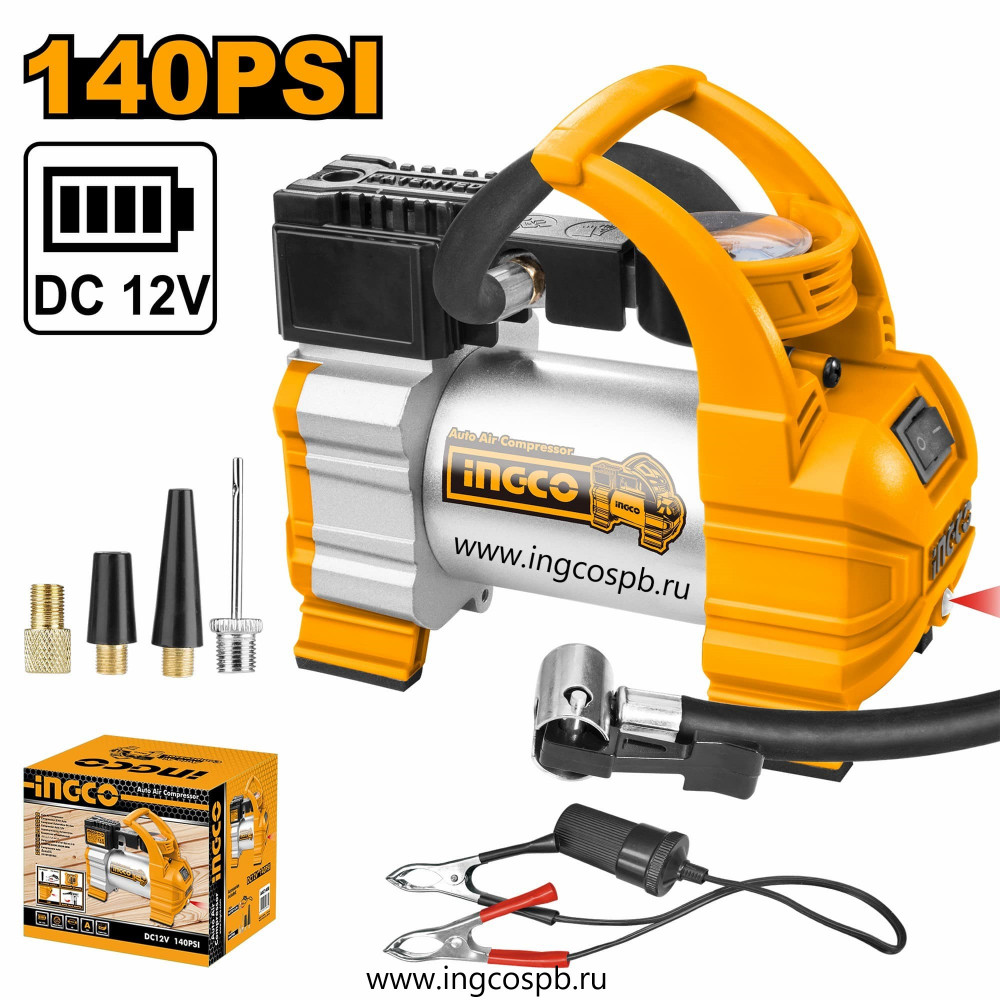 Автомобильный компрессор 12В, 10 бар. INGCO AAC1408 работает от прикуривателя автомобиля 12В, это компактное приспособление, которое с легкостью поместится в багажник любого транспорта.