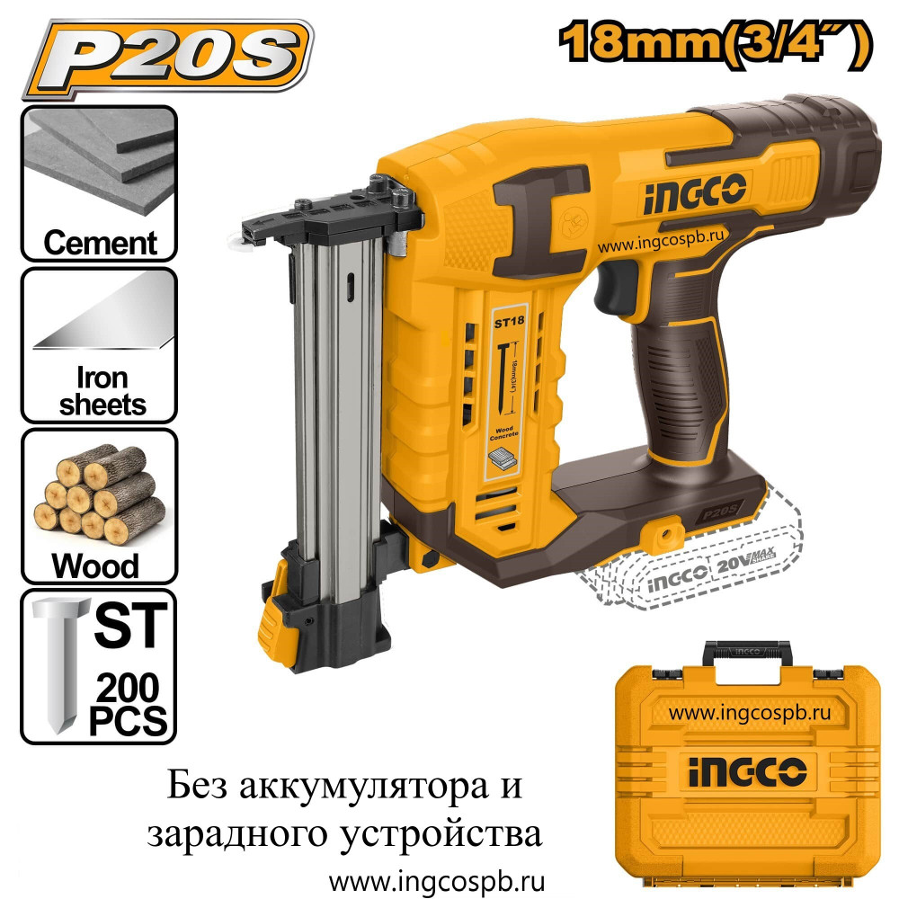Аккумуляторный нейлер 20В ST 18мм без АКБ и ЗУ кейс SUPER INGCO CSTLI3805 пригодится при изготовлении строительных каркасов, крепления древесины к бетону и кирпичной кладке, настилки чернового пола и деревянных упаковок, сборки алюминиевых профилей непосредственно на бетоне т.д.