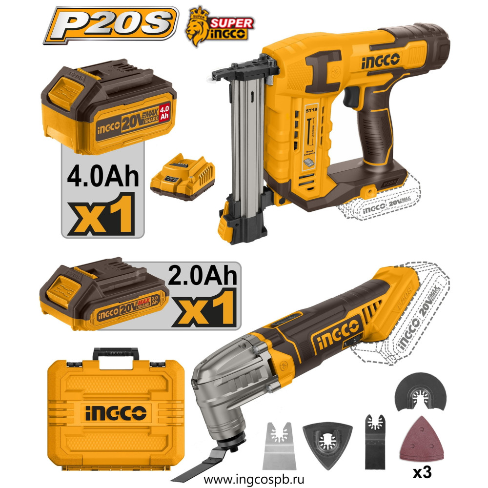 Набор нейлер и реноватор 20в 2хАКБ и ЗУ кейс SUPER INGCO COSLI24021 INDUSTRIAL включает в себя аккумуляторный реноватор и реноватор на единой платформе P20S