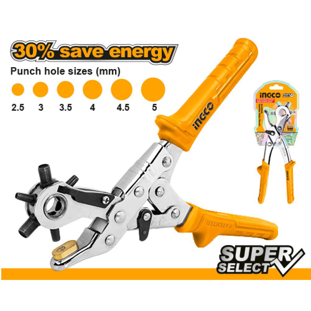 Дырокол револьверный для кожи INGCO HLHP028 используется для получения сквозных круглых отверстий в картоне, коже, резине, пластике.