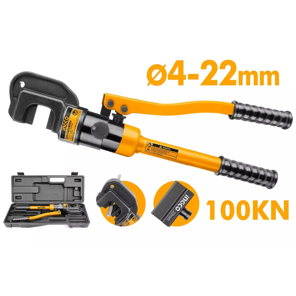 Гидравлический ручной резак 4-22мм INGCO HHSC0122 используется для резки стальной арматуры диаметром до 22 мм с усилием 11 тонн. Инструмент применяется в строительстве, производстве, в мастерских и станциях технического обслуживания.