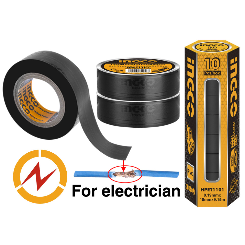 Изолента черная ПВХ 18мм х 9,15м INGCO HPET1101 INDUSTRIAL применяется для электроизоляции при ремонте проводов и кабелей.