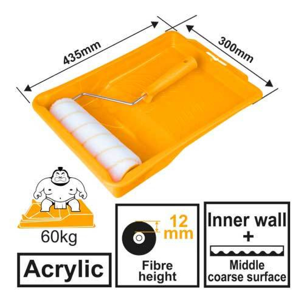 Малярный набор INGCO HKTCB032301 для отделки внутренних стенвключает в себя ванночку размерами 405х300мм, ручка для валика и валик из акрила шириной 230 мм. Высота ворса - 12 мм. Ножки на ванночке обеспечивают наклон для экономного расхода краски и удобства использования.