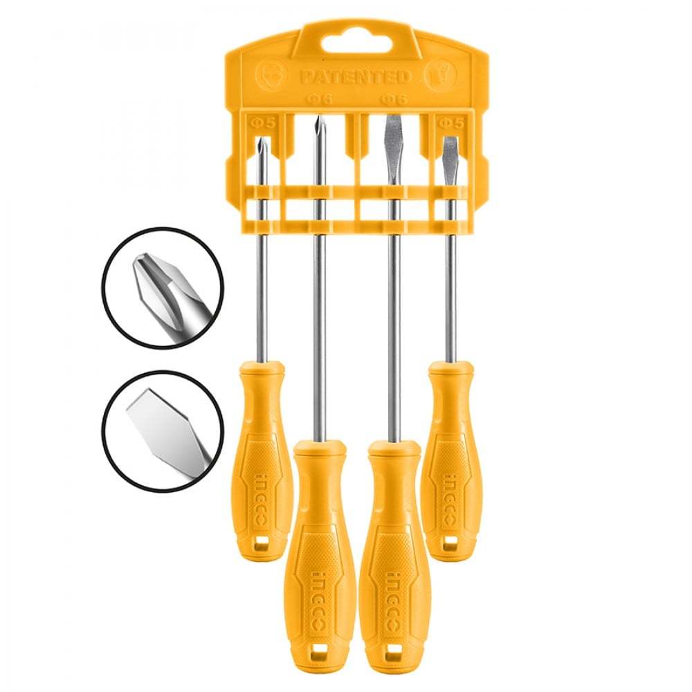 Набор отвертокINGCO HKSD0458 имеет в комплекте две отвертки с прямым шлицем и две отвертки с крестовым.