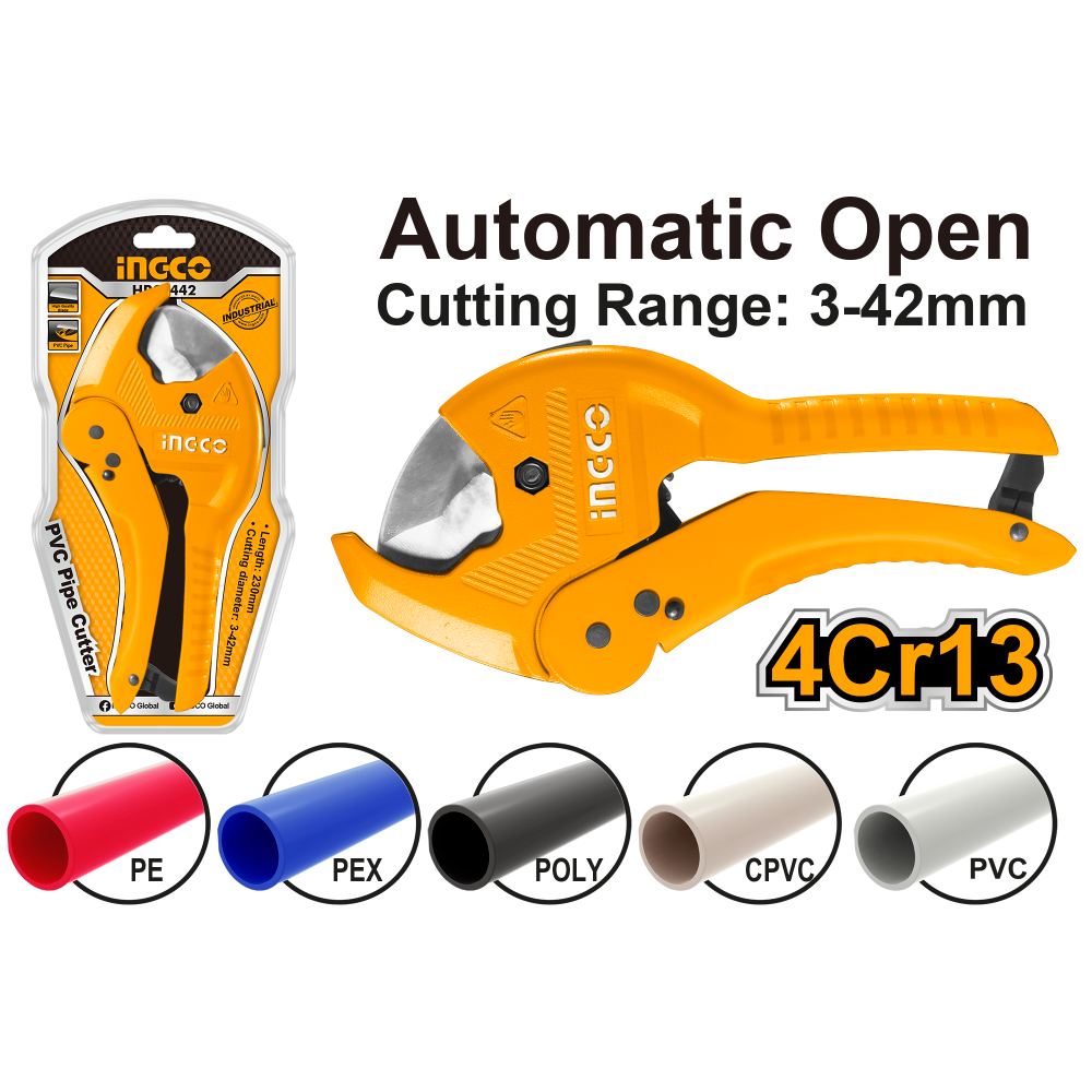 Ножницы для резки пластиковых труб INGCO HPC0442 INDUSTRIAL - применяется для резки труб с максимальным диаметром 42 мм подходит для: PEX, PE, PU, POLY, CPVC, PVC.