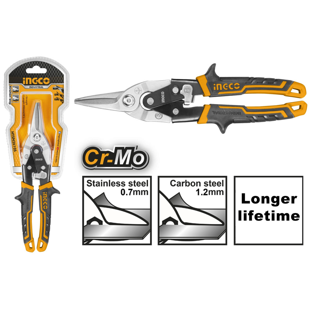 Ножницы по металлу - прямые 250 мм INGCO HTSN2610S INDUSTRIAL - удобный ручной инструмент, который подойдет для разрезания различных материалов металла, линолеума, пластика, резины, картона.