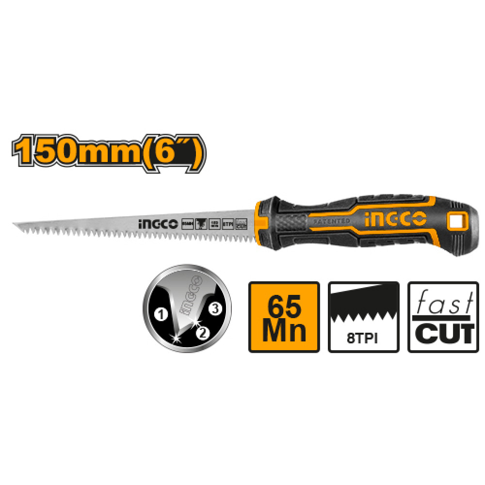 Ножовка по гипсокартону 150мм INGCO HWBSW628C идеально подходит для вырезания отверстий в гипсокартонных плитах за счет более толстого и твердого режущего лезвия.