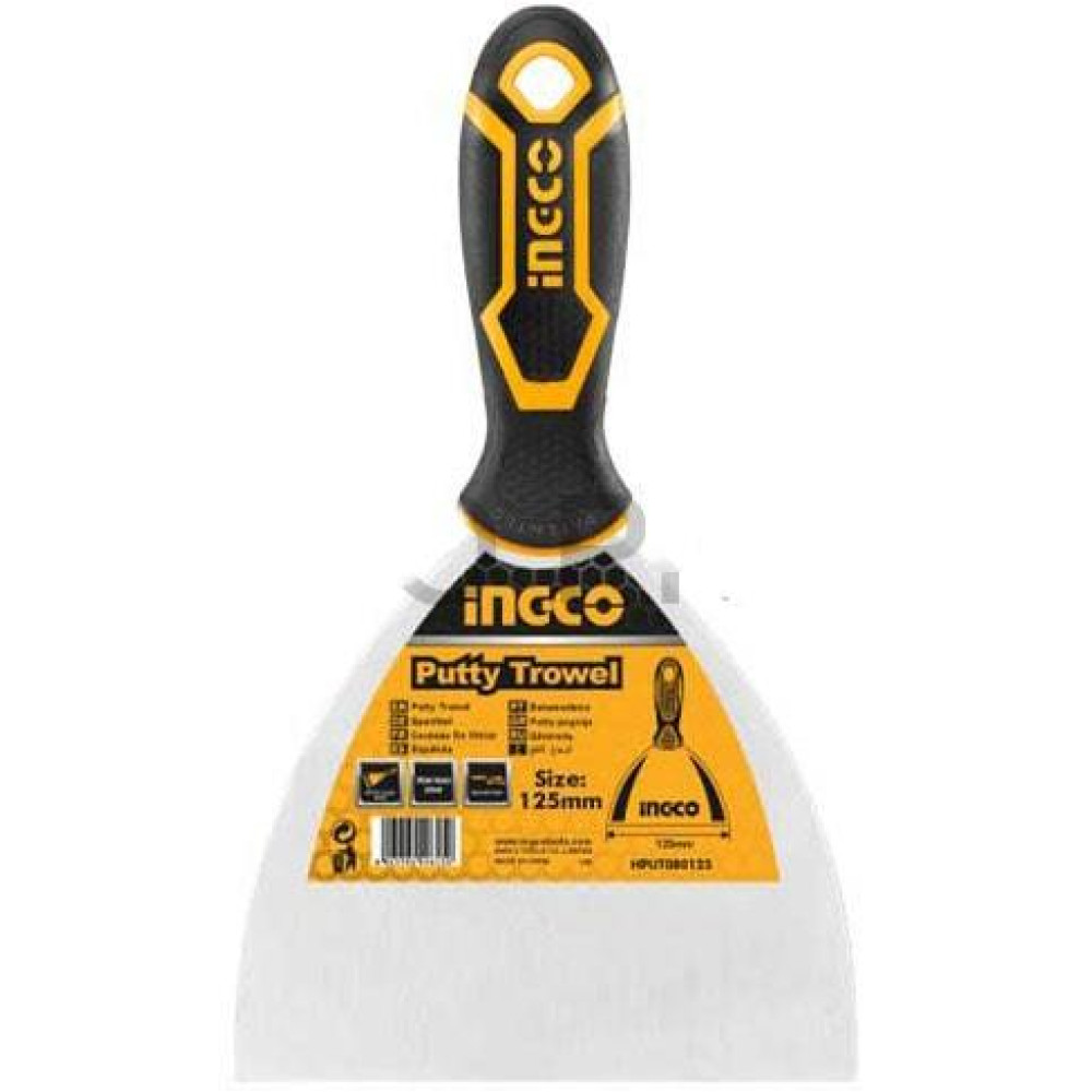 Шпатель 125 мм нерж. сталь, двухкомп. ручка INGCO HPUT08125 INDUSTRIAL используется при малярных и отделочных работах с целью нанесения и разравнивания строительных и клеевых составов.