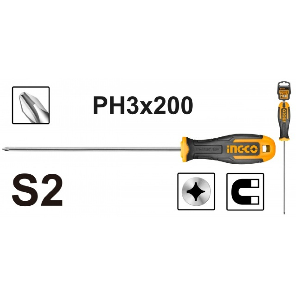 Отвертка крестовая PH3x200 мм INGCO HS68PH3200 INDUSTRIAL с крестовым шлицем Phillips применяется для различных работ с крепежом.