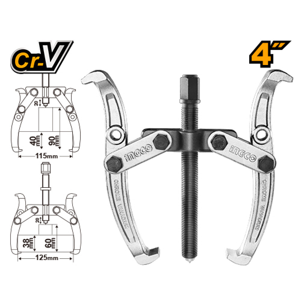 Съемник с двумя захватами 100мм INGCO HGP08024 INDUSTRIAL применяется для демонтажа подшипников, шкивов, шестерен с захватом за внешнюю часть детали и где это необходимо и возможно технологически за внутреннюю, переустановив захваты.