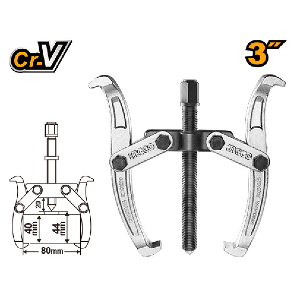 Съемник с двумя захватами 75мм INGCO HGP08023 INDUSTRIAL применяется для демонтажа подшипников, шкивов, шестерен с захватом за внешнюю часть детали и где это необходимо и возможно технологически за внутреннюю, переустановив захваты.