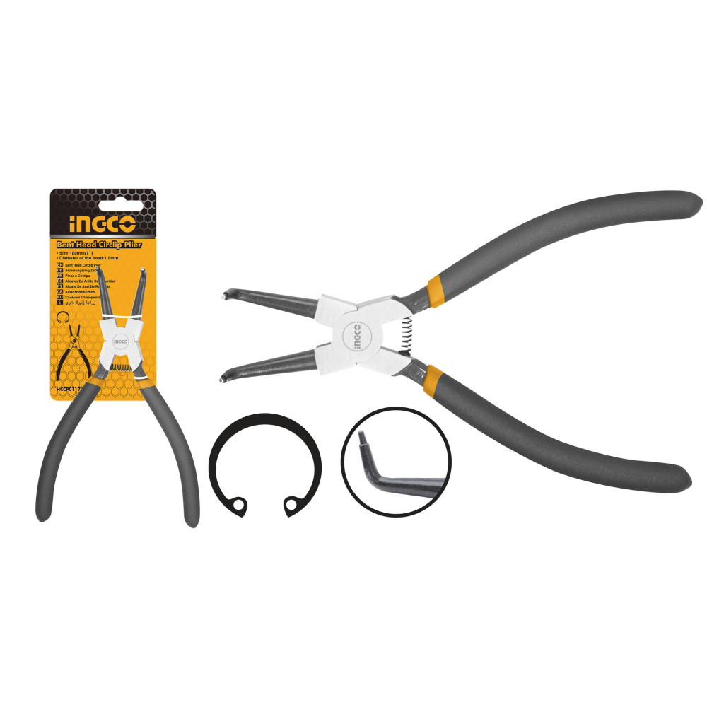 Съемник стопорных колец 180мм изогнутые внутренние INGCO HCCP011752инструмент предназначен для работы со стопорными кольцами изготовлены из углеродистой стали,которая обладает высокой прочностью и износостойкостью.