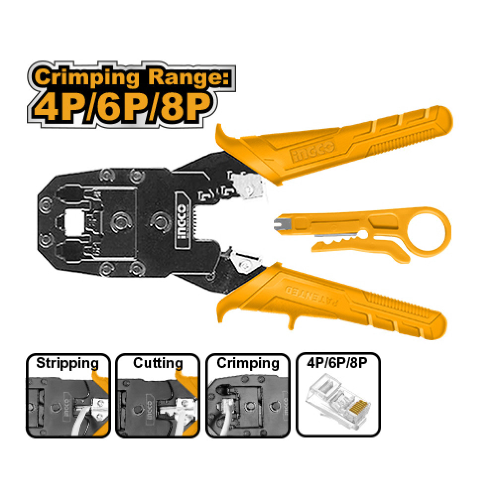 Кримпер для обжима телефонных и компьютерных клемм INGCO HMPC1468P предназначен для перекусывания или обжима кабелей и проводов для подключения компьютеров или телефонов и имеют типоразмер 4P/6P/8P, RJ-45, RJ-11, RJ-12.