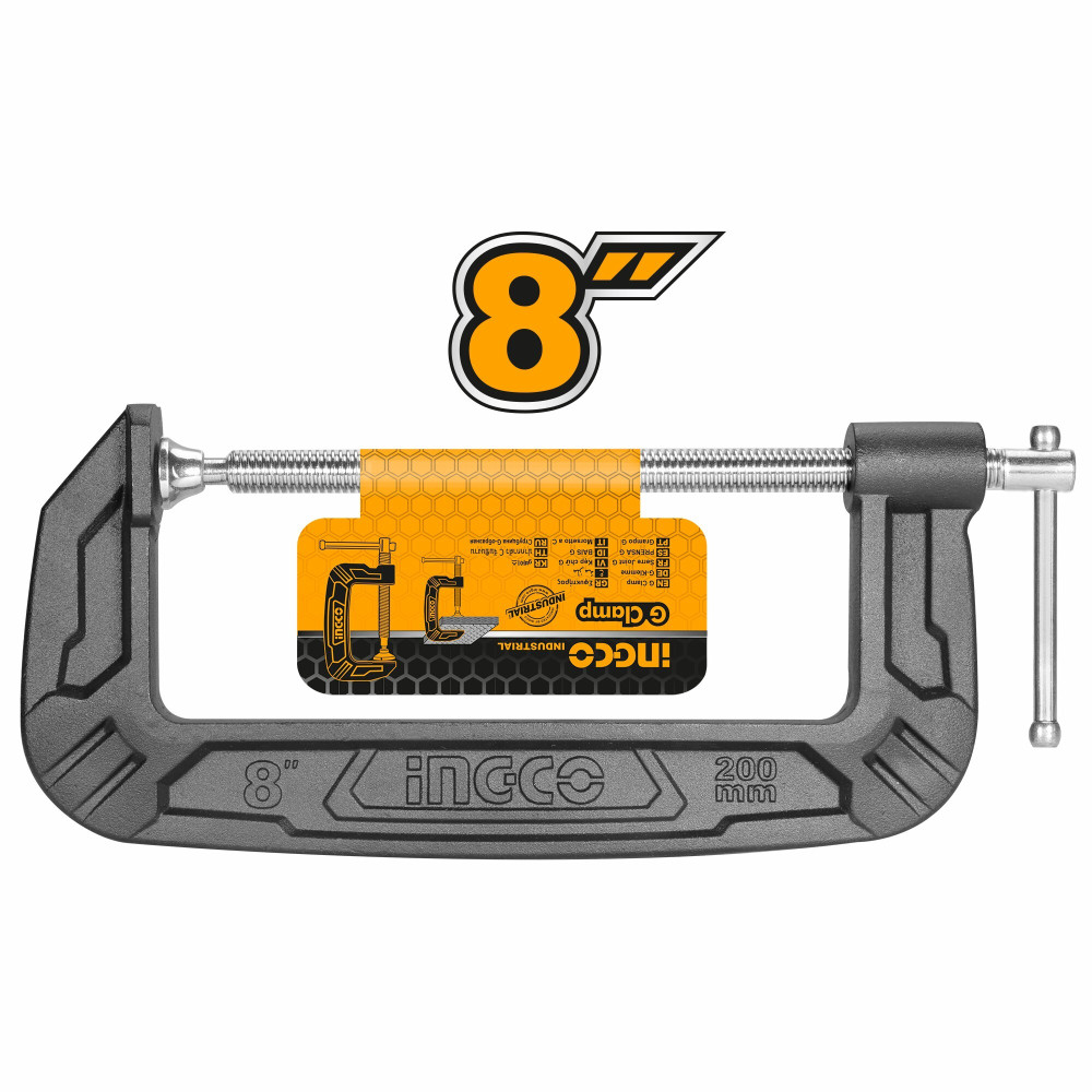 Струбцина G-образная 200 мм INGCO HGC0108 INDUSTRIAL предназначена для зажима и фиксации заготовок и деталей при склеивании и других слесарных работах.