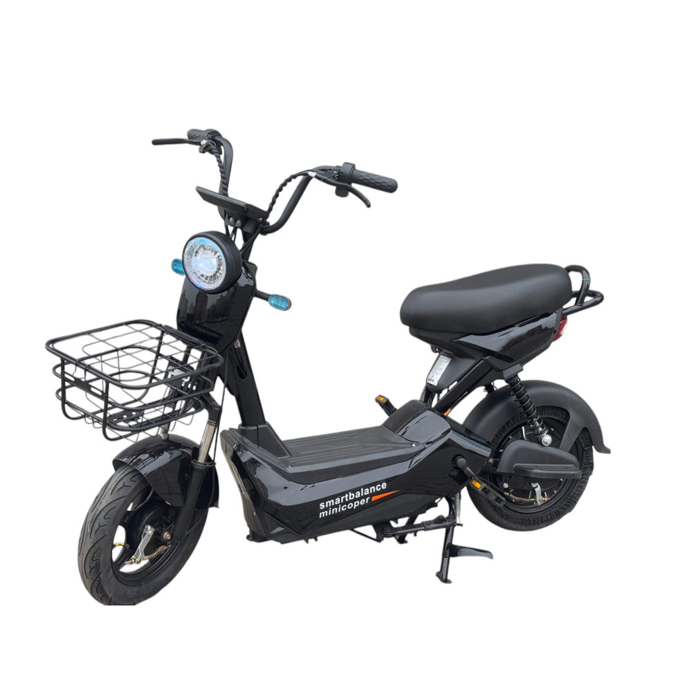 Купить электровелосипед SmartBalance Minicooper Летом 2023 года наша компания представила свой 1 электровелосипед под собственным брендом SmartBalance. Он успел покорить сердца огромного количества наших покупателей и без преувелечения стал самым популярным электровелосипедом в нашем магазине. Именно поэтому мы решили выпустить целую линйку электровелосипедов и электроскутеров под брендом SmartBalance, в которой найдётся электровелосипед для покупателя с любыми запросами. Представляем вашему вниманию электроскутер SmartBalance Minicooper - одна из самых интересных моделей в линейке SmartBalance. Миникупер сочетает в себе и электроскутер, и электровелосипед. Этот скутер имеет 2 места. У места для пассажира даже есть спинка. Спереди установлена вместительная металлическая корзина, поэтому этот электроскутер отлично подойдёт для поездок, например, на дачу. А большой запас аккумулятора позволит работать на нём в службе доставке. Смарт Баланс Миникупер имеет дизайн классического скутер, что выгодно отличает его от конкурентов. Основные характеристики SmartBalance Minicooper: Двигатель 240 Вт Скорость до 25 км/ч Аккумулятор 20 Ач Запас хода до 45 км Нагрузка до 150 кг Преимущества СмартБаланс Миникупер: Дизайн классического скутера Дополнительно место для пассажира со спинкой Очень большая и яркая фара Поворотники и задний стоп-сигнал Большая ёмкость аккумулятора