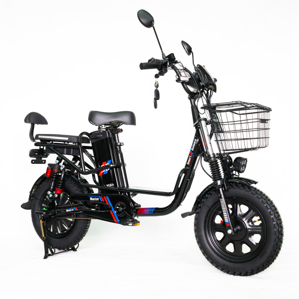 Электровелосипед SmartBalance Master в Минске и Беларуси Электровелосипед Smart Balance Master - это мощный и универсальный городской транспорт, разработанный для комфортного передвижения по различным поверхностям и перевозки грузов. Он оснащен мотор-колесом заднего привода с номинальной мощностью 240 Вт и пиковой до 1200 Вт, что позволяет развивать скорость до 25 км/ч . Аккумулятор ёмкостью 20 А·ч обеспечивает запас хода до 60-70 км в режиме электроассистента, а гидравлические дисковые тормоза гарантируют безопасность даже при полной нагрузке, весом 38 кг. Ключевые особенности: Грузоподъёмность до 130 кг - подходит для перевозки пассажиров или объёмных грузов. Универсальная комплектация: металлическая корзина, багажник, подножка, стоп-сигнал и зеркала заднего вида. Три режима езды: полная электротяга, помощь педалям и классический велосипед. Проходимость: 16-дюймовые колёса с внедорожным протектором и амортизация спереди и сзади. Для кого он подходит: Курьеры и дачники - вместительный багажник и возможность трансформации пассажирского сиденья в грузовую площадку делают его идеальным для перевозки продуктов, инструментов или посылок. Городские жители - компактные размеры и маневренность помогают избегать пробок, а яркая фара обеспечивает безопасность в темноте. Активные пользователи - подходит для поездок на рыбалку, загородные прогулки или ежедневные маршруты по городу. Подробно про все элементы электровелосипеда SmartBalance Master Руль Дисплей Данная модель обладает бортовым компьютером с LCD дисплеем. На этом дисплее отображается следующая информация о поездке: скорость движения; пробег; заряд аккумулятора; режим скоростей; Левая рукоятка На левой рукоятке расположены: кнопки переключения передач; управление поворотниками; кнопка звукового сигнала; ручка тормоза; Правая рукоятка На правой рукоятке расположены: ручка газа; ручка тормоза; замок зажигания; Высота руля не регулируется. Освещение Поворотники Поворотники расположены спереди и сзади. Передняя фара На передней вилке установлена яркая линзированная фара. Стоп-сигнал Мотор-колесо и аккумулятор Электромотор На этом электровелосипеде установлено мотор-колесо мощностью 240 Вт. Он может развивать скорость до 25 км/ч (без использования педалей). Согласно ПДД Республики Беларусь такой набор характеристик позволяет отнести модель к велосипедам. Это значит, что для управления вам не нужны права. Главное, помните, что передвигаться на нём можно только по велодорожке (или тротуару в случае её отсутствия) со скоростью до 25 км/ч. Пиковая мощность мотора - 1200 Вт. Мотор редуктороного типа. Аккумулятор Установлен литий-ионный аккумулятор на 20 Ач. Он позволяет проехать до 60-70 км в режиме помощника. Подножка Усиленная велосипедная подножка. Колёса и тормоза Передний тормоз Установлен дисковый гидравлический тормоз. Задний тормоз Установлен дисковый гидравлический тормоз. Колёса На этой модели установлены покрышки с камерой, диаметр - 16". Корзина и багажник Корзина Объёмная металлическая закрывающаяся корзина установлена на передней вилке. Багажник На месте багажника может быть установлено место для пассажира или сам багажник. Амортизация Передняя амортизация Спереди установлена пружинно-масленная амортизация. Задняя амортизация Сзади установлена пружинная амортизация. Интересные особенности мод